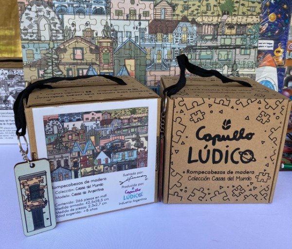 Rompecabezas de madera mdf 3mm de 266 piezas con diseño de "Casas de Argentina", ilustrado por Sol Fernandez. Este producto pertenece a la colección de "Casas del Mundo".